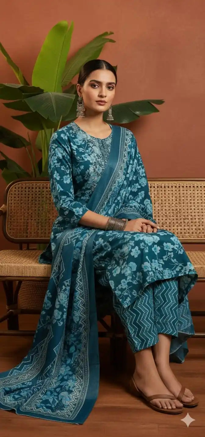 Readymade Block Print Cotton Suit With Cotton Dupatta