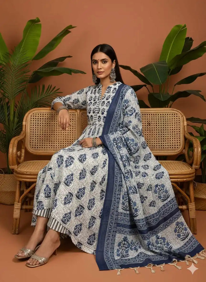Frock With Neck Yoke Patch, Block Print Cream Color With Cotton Pant & Mal Dupatta
