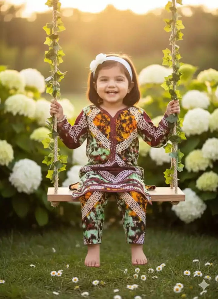 Girls Kids Karachi Lace Rayon Kurta Pant Straight Cut Cord-Sets