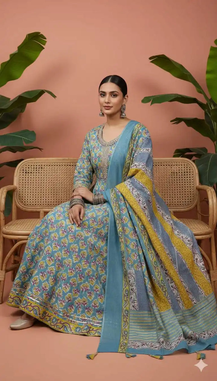 Gown With Kali In Premium Cotton Fabric, Cotton Pant, Mal Cotton Print Dupatta