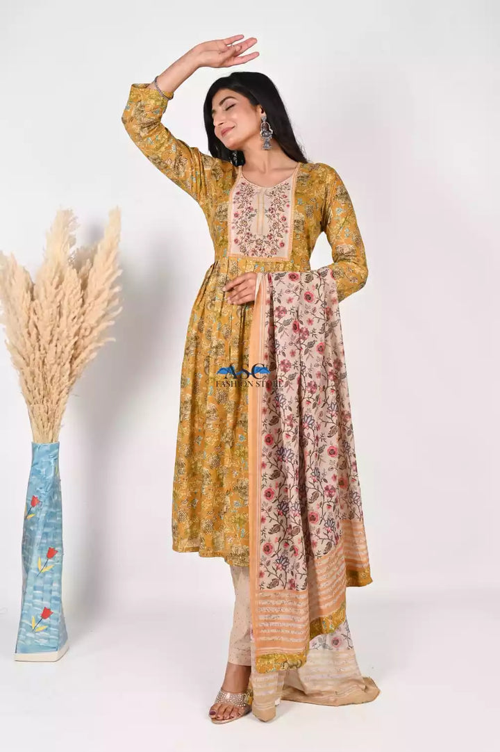 Naira Cut Neck Hand work Readymade Cotton Floral Print With Tabby Silk Digital Dupatta