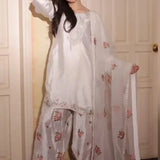 Paired with a stunning organza embroidered dupatta and farshi salwar with embroidery, giving a rich and graceful look.
