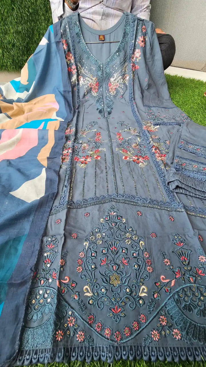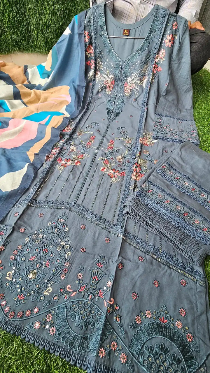 Readymade Rayon Karachi Embroidered Suit Part Wear With Comfortable Pant, Maslin Digital Print Dupatta