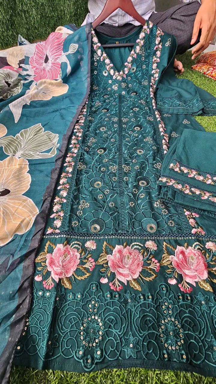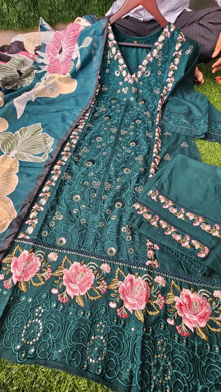 Readymade Rayon Karachi Embroidered Suit Part Wear With Comfortable Pant, Maslin Digital Print Dupatta