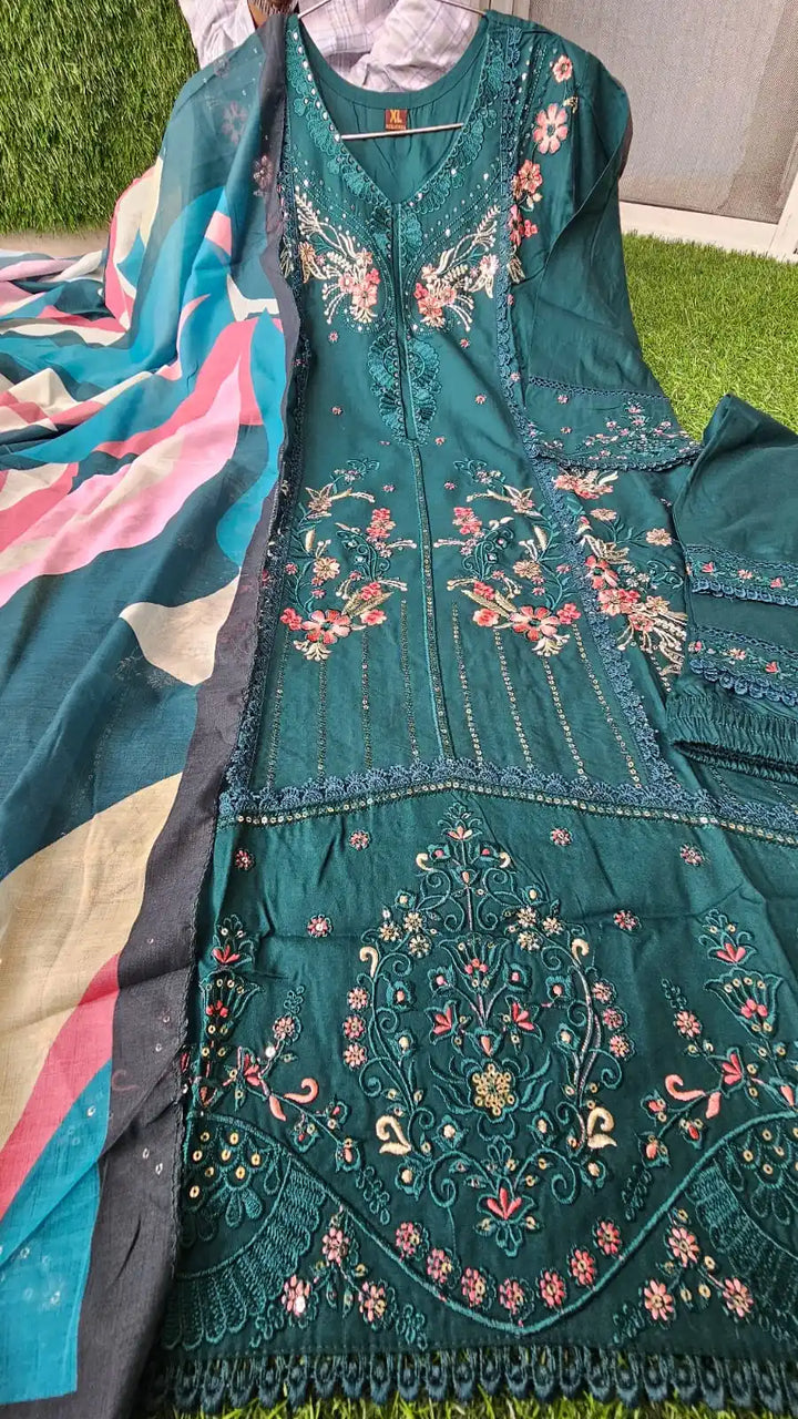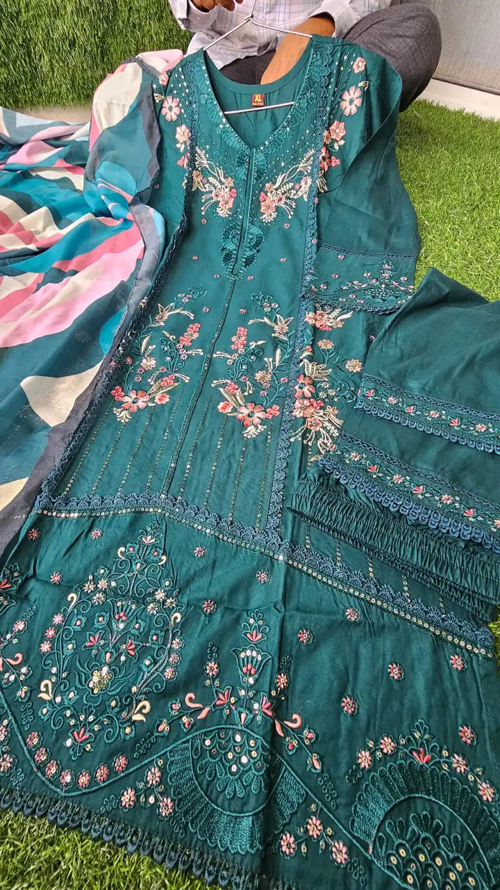 Readymade Rayon Karachi Embroidered Suit Part Wear With Comfortable Pant, Maslin Digital Print Dupatta
