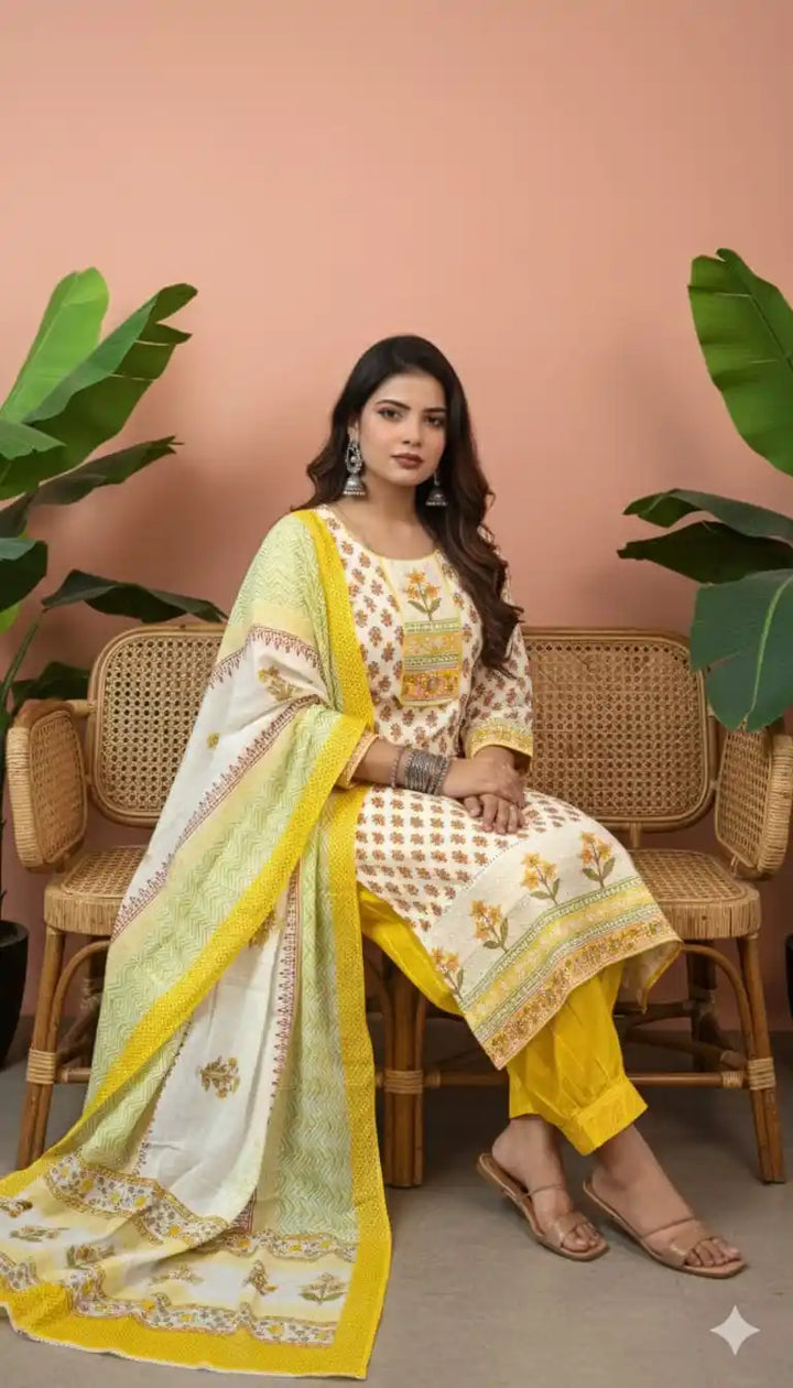 Straight Cut Block Print Cotton Suit With Chikenkari Work & Lining, With Salwar