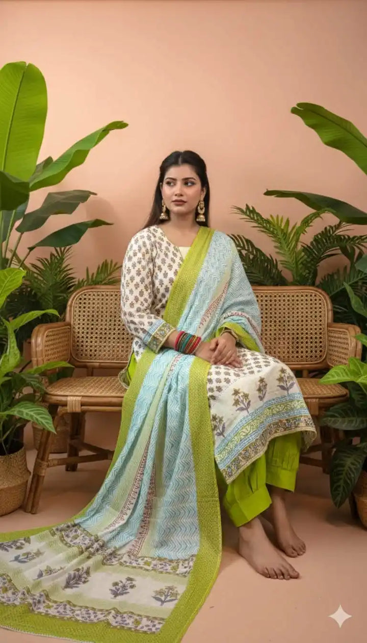 Straight Cut Block Print Cotton Suit With Chikenkari Work & Lining, With Salwar